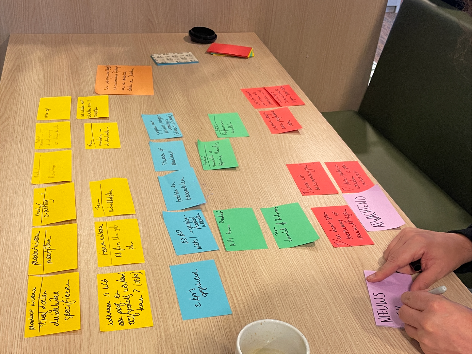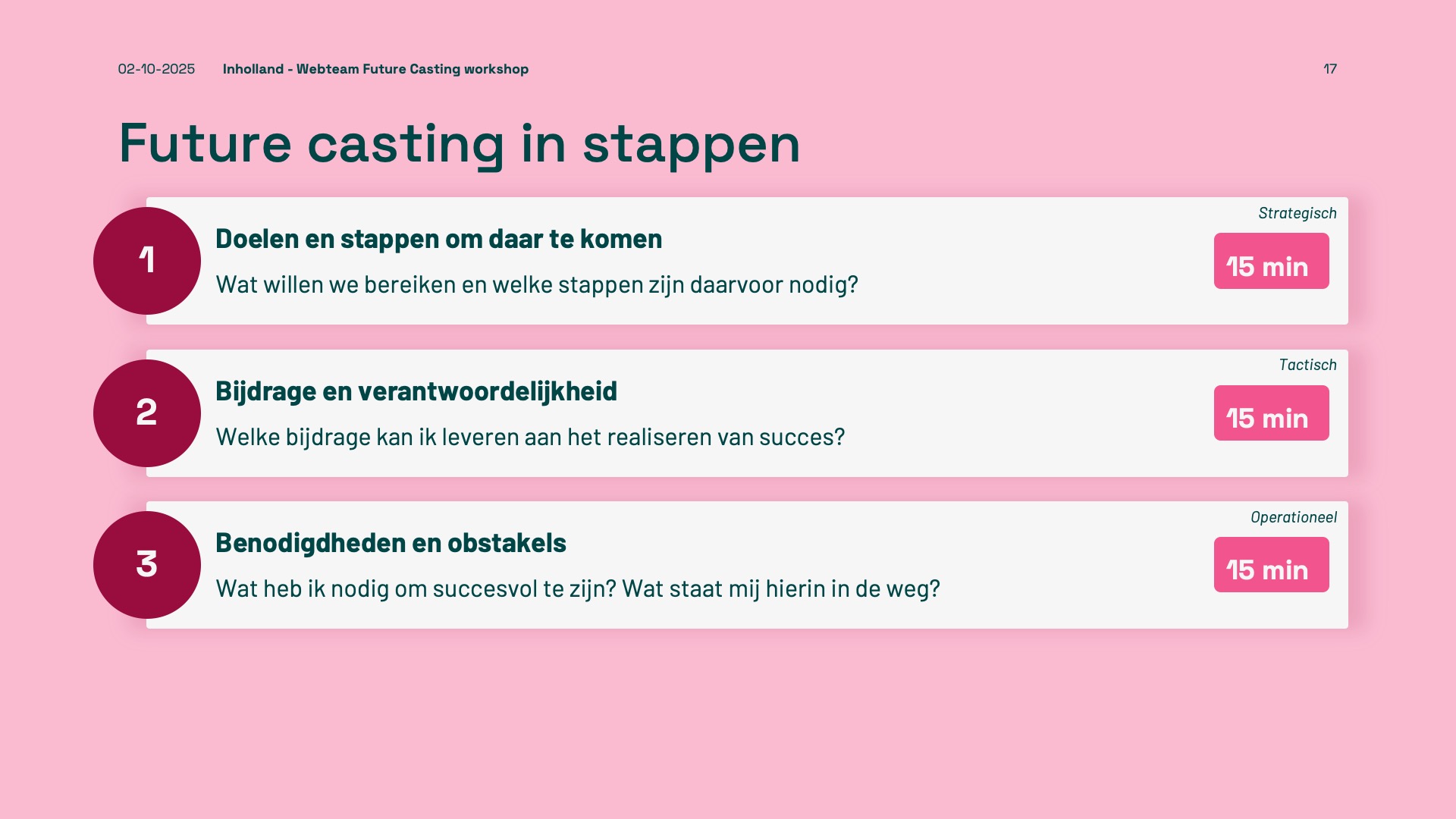 Met de Future Casting-methode startten we vanuit een gewenste toekomst: wanneer is het webteam succesvol? En welke doelstellingen moeten worden behaald om dit succes te verzilveren? Vanuit dat eindbeeld werkten we stap voor stap terug naar het heden. Het team bracht gezamenlijke doelen, tussenstappen en concrete acties in kaart. Door deze omgekeerde tijdlijn ontstond focus en gedeeld begrip. Abstracte ambities werden vertaald naar tastbare stappen op strategisch, tactisch en operationeel niveau. Deze fase zorgde voor rust, richting en een gedeeld referentiekader: iedereen keek naar hetzelfde doel, maar ook naar wat nú nodig is om daar te komen.